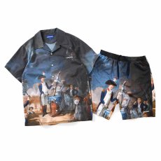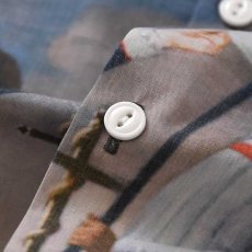 ブランドの根幹となっているラファイエット侯爵がフランス革命の英雄としてパリで 表彰される様子を描いた絵画を全面にプリントしたオープンカラーシャツ。