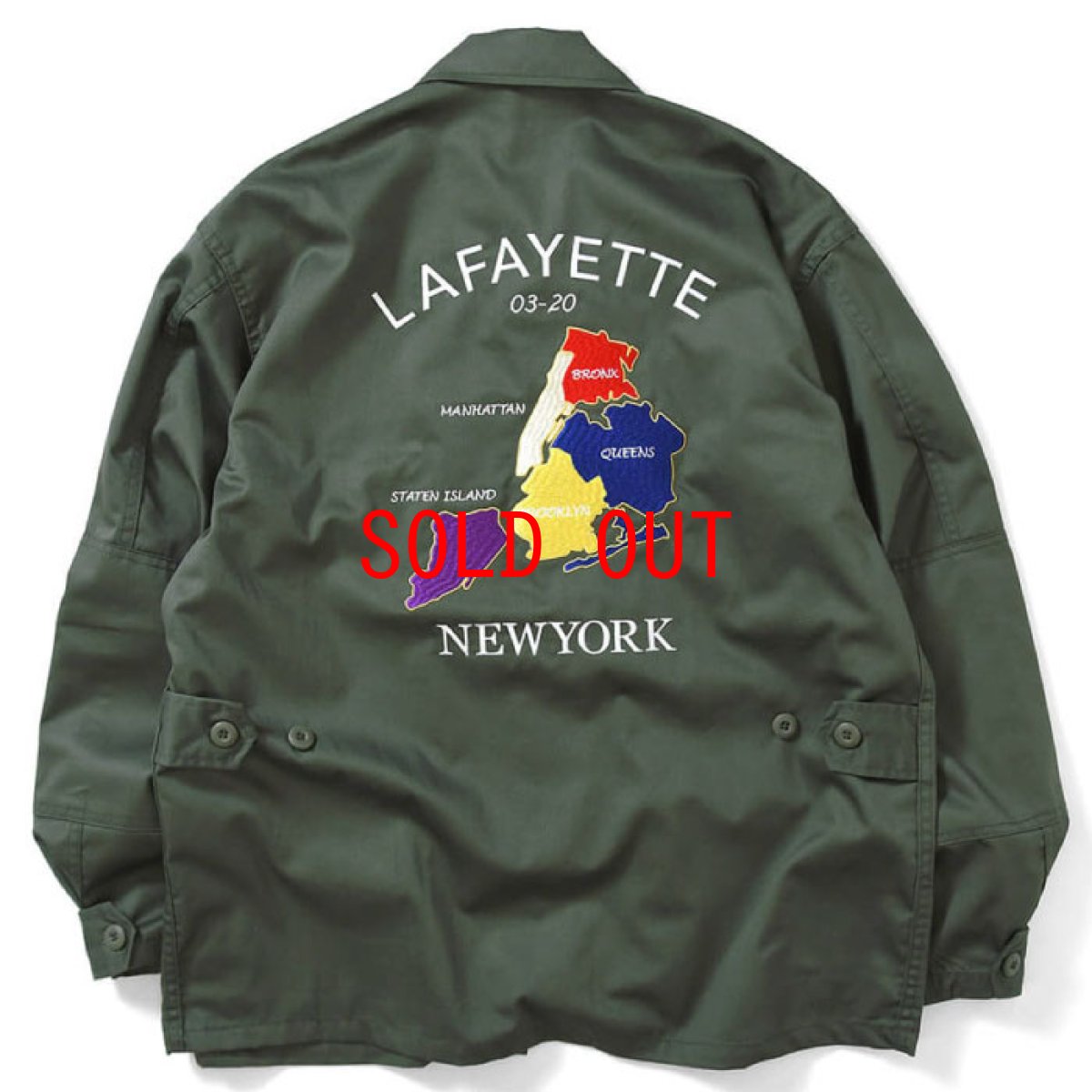 バックには、ベトナム戦争下でスーベニア(お土産)として重宝された通称「ベトナムジャケット」を彷彿とさせる、NY 5 BOROの地図とLafayetteのロゴを刺繍したヴィンテージライクな仕上がり。