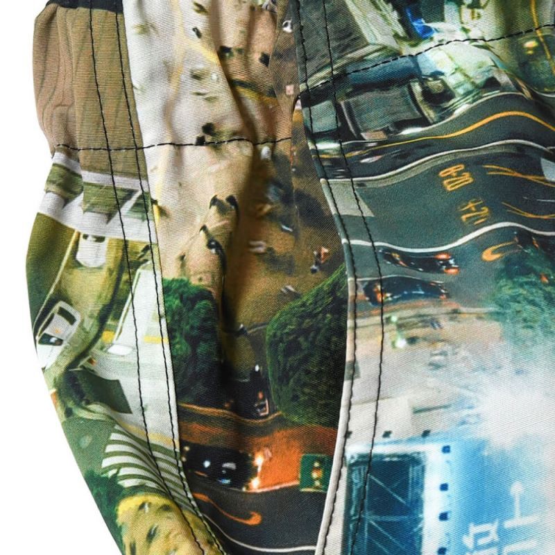 夜の渋谷スクランブル交差点を上空から捉えた写真を、全面にフルプリントしたカーゴショーツ。