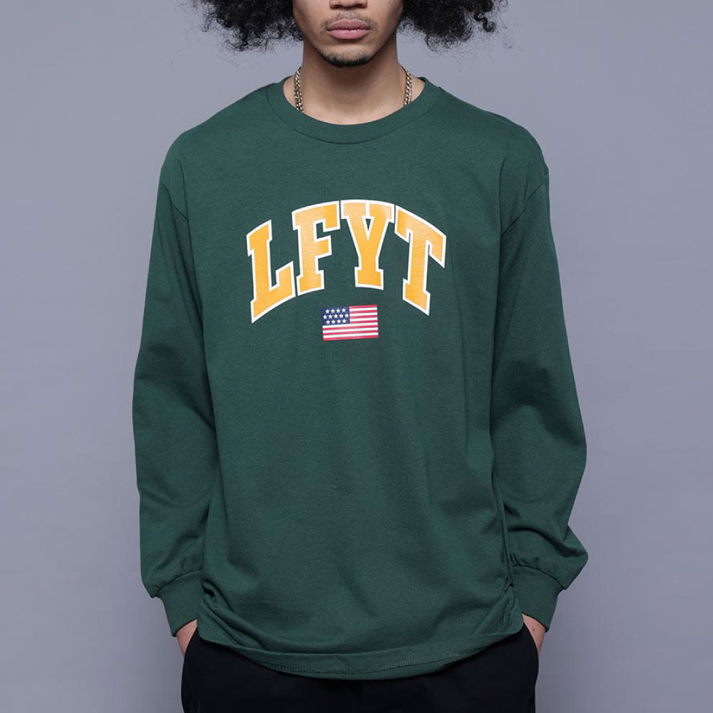 LFYTアーチロゴに星条旗を掛け合わせたデザインのロングスリーブTシャツ。