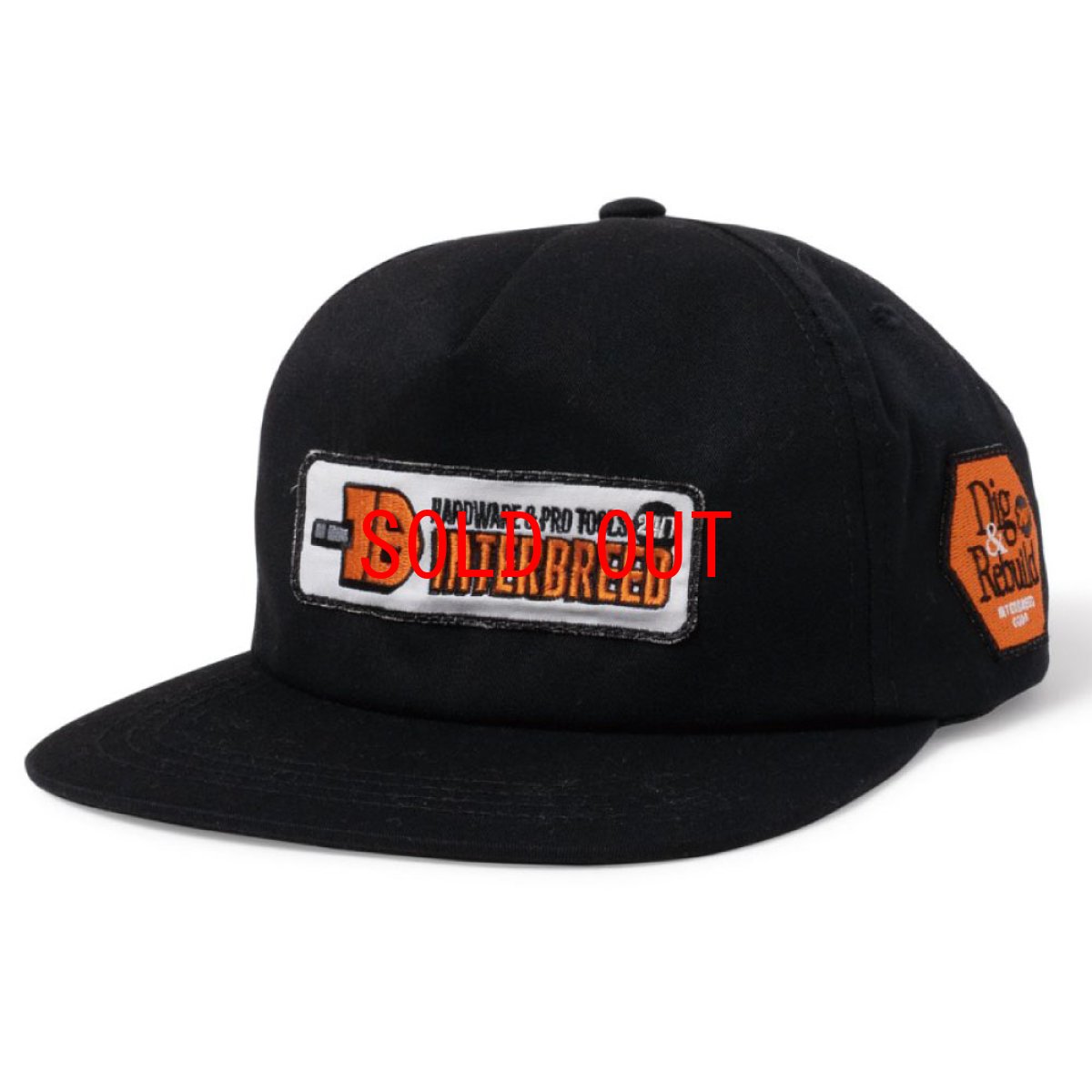 フロントには工具店のロゴパッチ、 左サイドにはシガレットホルダーが付属した”Dig & Rebuild”のスローガンパッチが付属し、 右サイドにはRAWのロゴ刺繍が入ります。