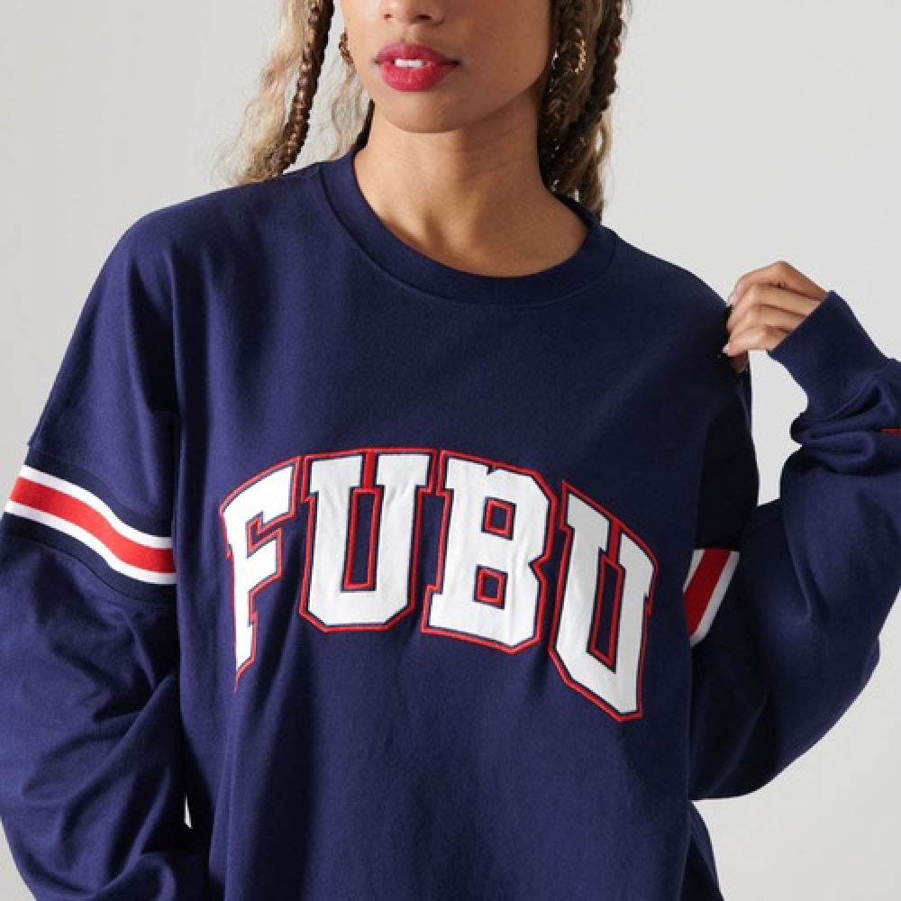 フロントにロゴのツイルワッペンが刺繍されたFUBUの長袖Tとなります。