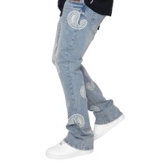 目を引くペイズリー柄が随所にデザインされたフレアシルエットのデニムパンツとなります。