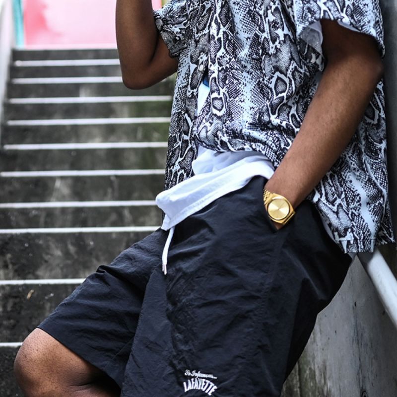 シャリ感のあるナイロン生地を使用した程よく短めな丈感のナイロンショーツとなります。
