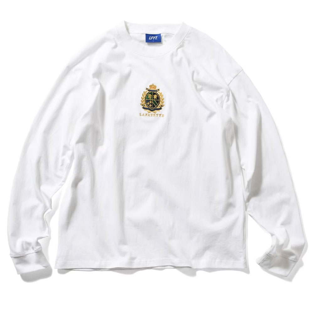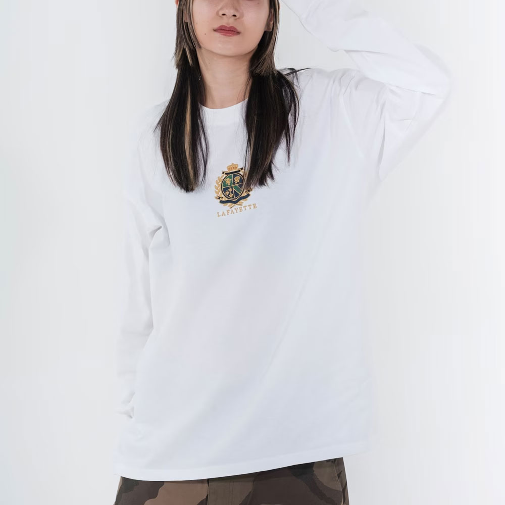 エンブレム調デザインを刺繍で表現したL/S TEE。